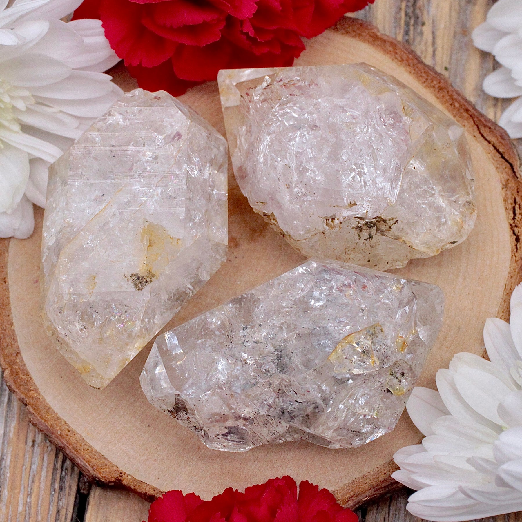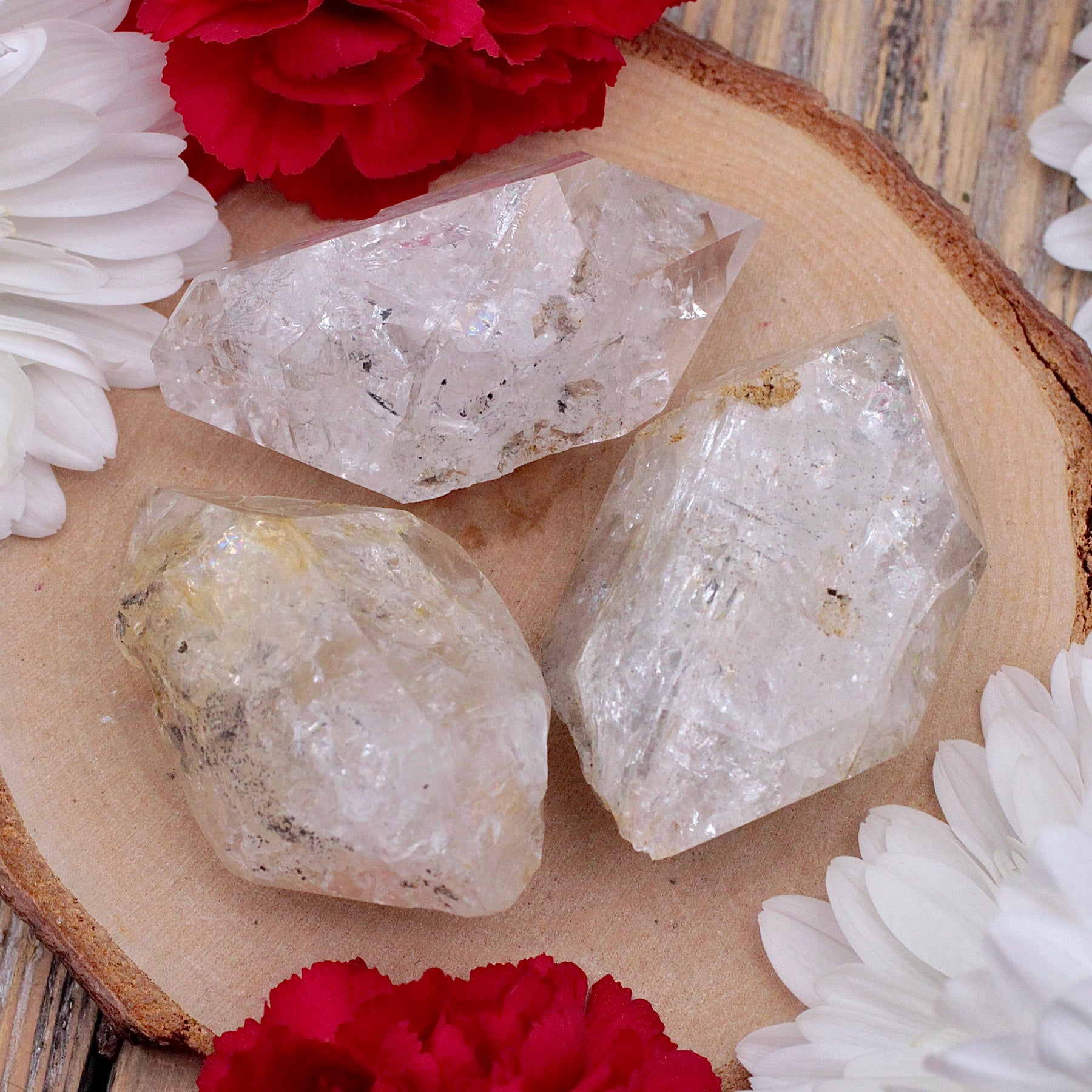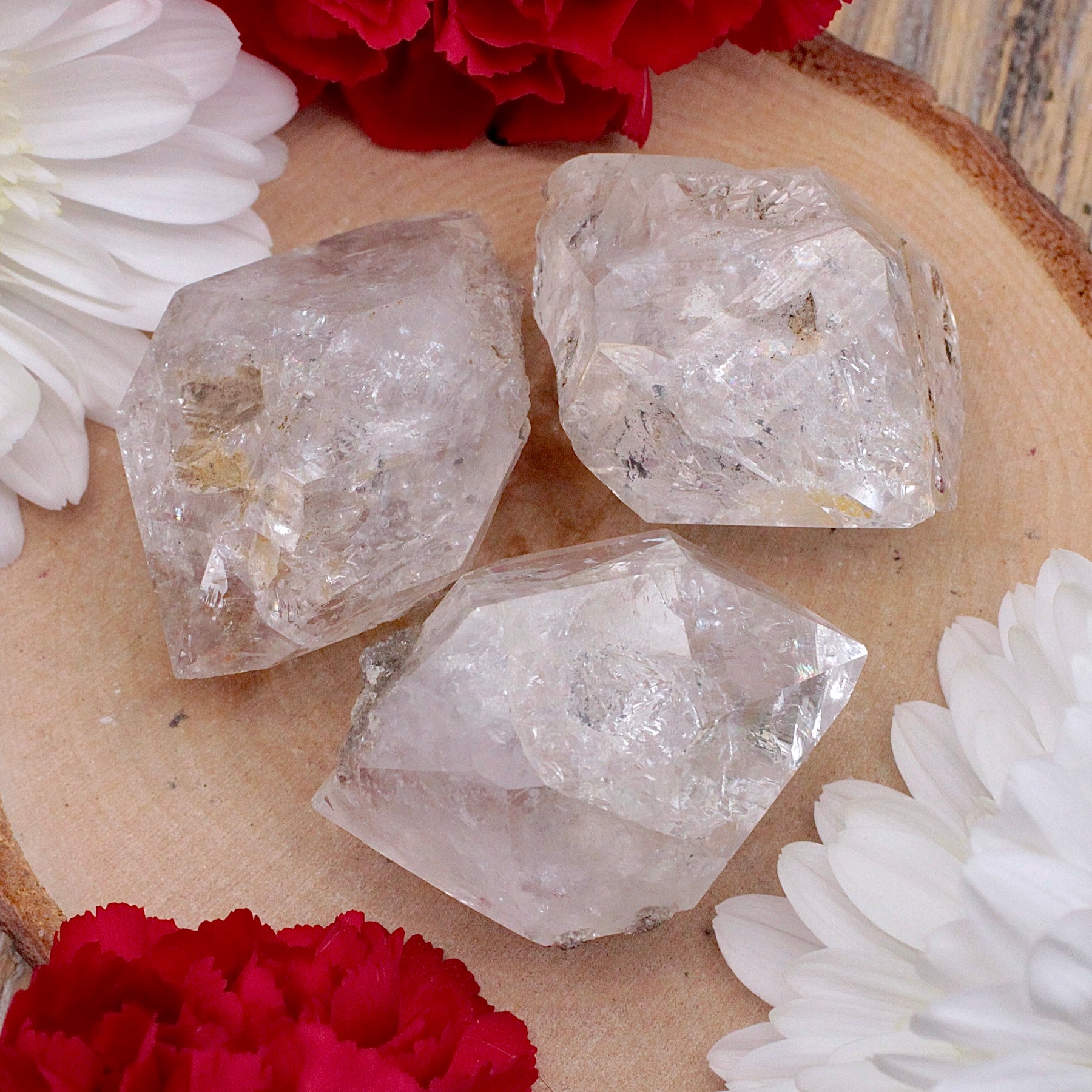 Herkimer Diamonds are actually a high vibration quartz, so named because of their naturally-formed double-terminated shape and because they are mined n the Herkimer County region in New York. They are generally very clear, even when inclusions are present. Energetically, they have the same amplifying, healing and spiritual benefits as Quartz Crystal, elevated and concentrated because of the double-termination. As a stone of attunement, Herkimers enhance interpersonal connections and can keep people close, despite physical distance. They are also useful allies in seeding, remembering and interpreting dreams.